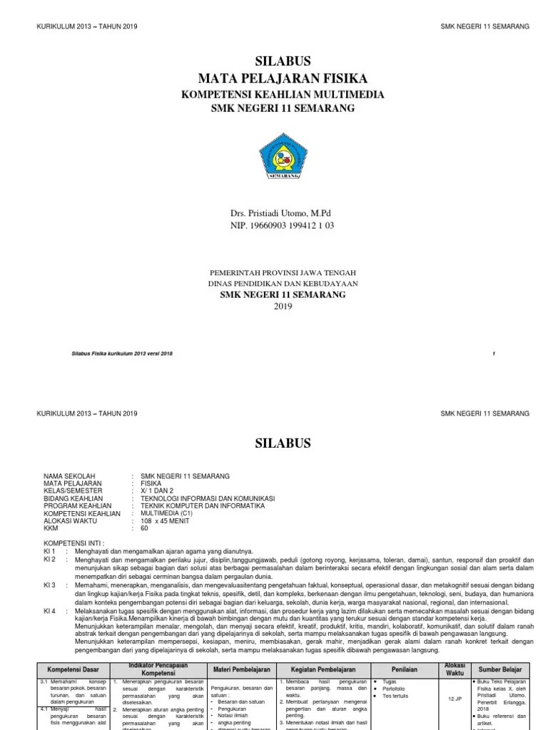 Kurikulum 2013 (smp) berikut ini link download silabus kurikulum 2013 semua mata pelajaran smp. Silabus adalah rencana pembelajaran pada suatu kelompok matapelajaran tertentu, yang mencakup standar kompetensi, kompetensi dasar, materi pembelajara. Silabus fisika kurikulum 2013 kelas xi. Rpp fisika sma berkarakter kelas x semester 1 download Waktu ketinggian, dan kecepatan satelit geostasioner 1.1 menyadari kebesaran tuhan yang menciptakan dan mengatur .